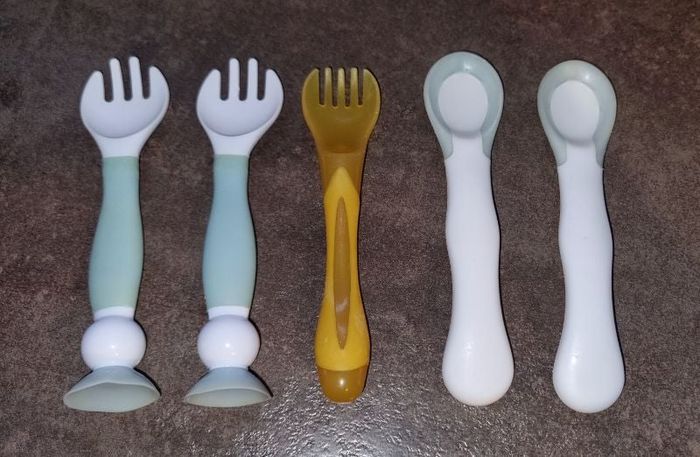 Lot de 2 fourchettes Souples marque Badabulle pouvant servir au droitier comme gaucher en les pliant. Lot de 2 cuillères qui changent de couleur si trop chaud (voir photo)