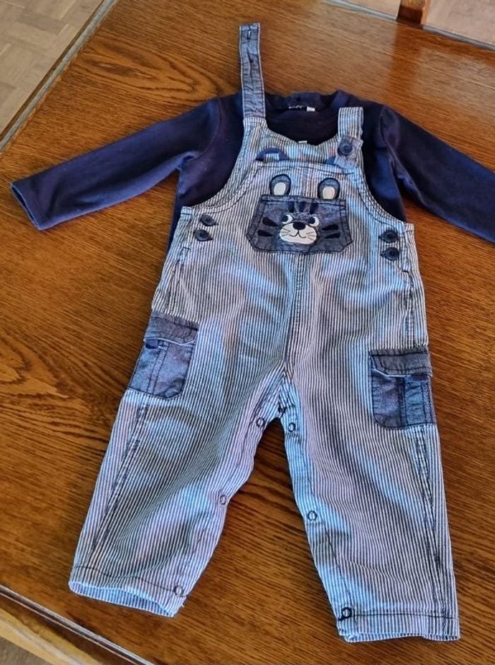 Salopette fine à rayures Motif tigre + pull fin bleu marine uni 3 boutons dans le dos