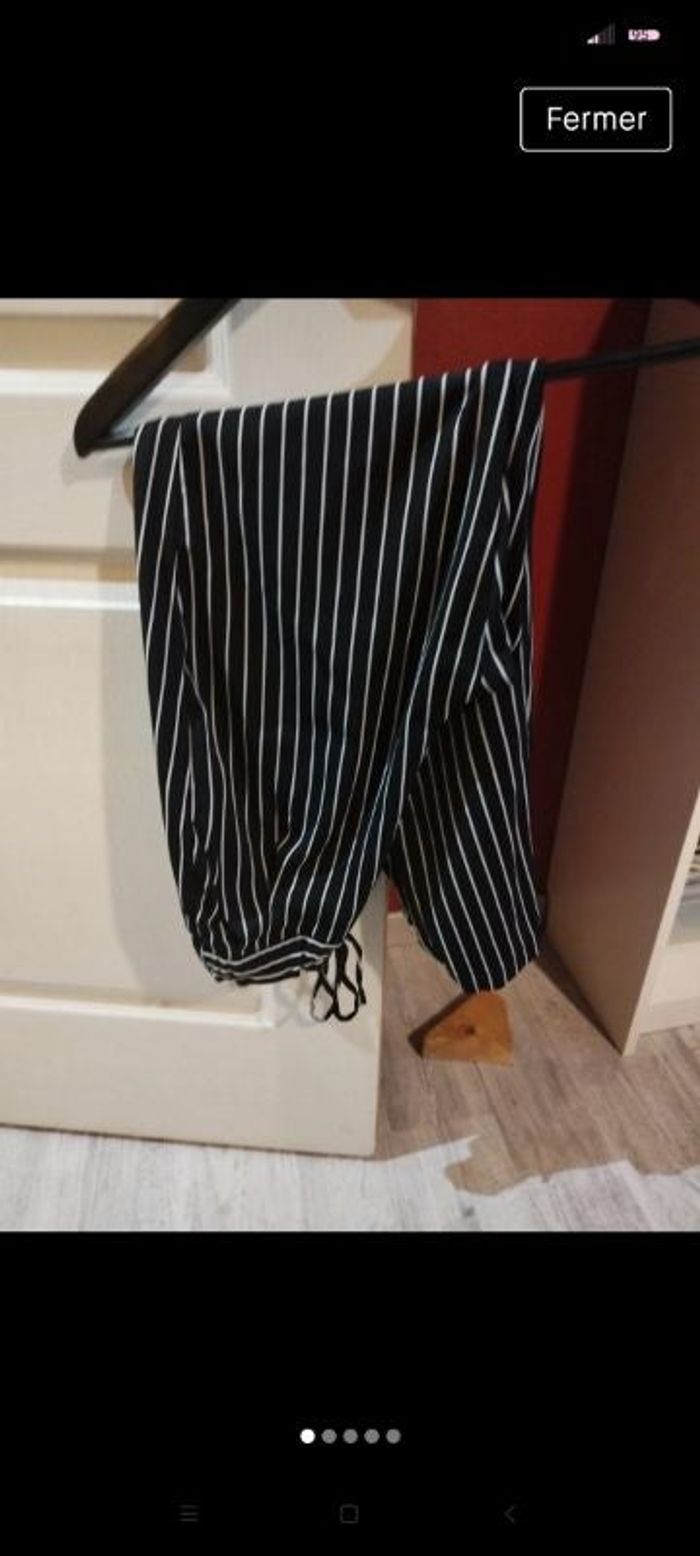 Pantalon ample à tissu léger de chez stradivarius. Couleur noir à rayures blanches. Lacet de serrage au niveau de la taille bas resserré par élastique