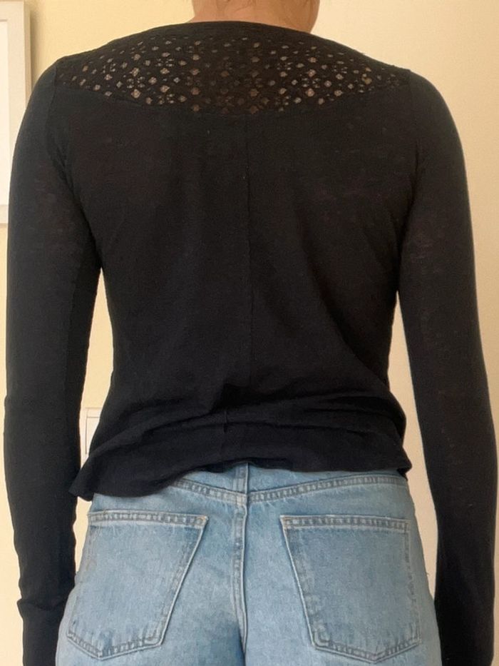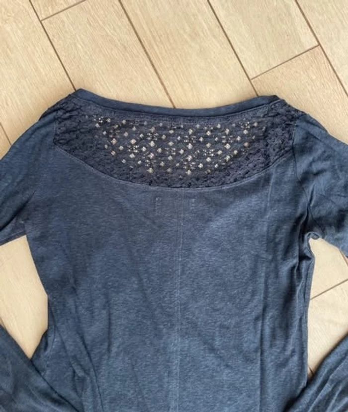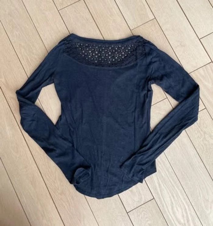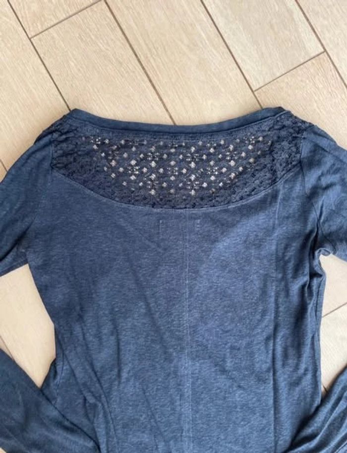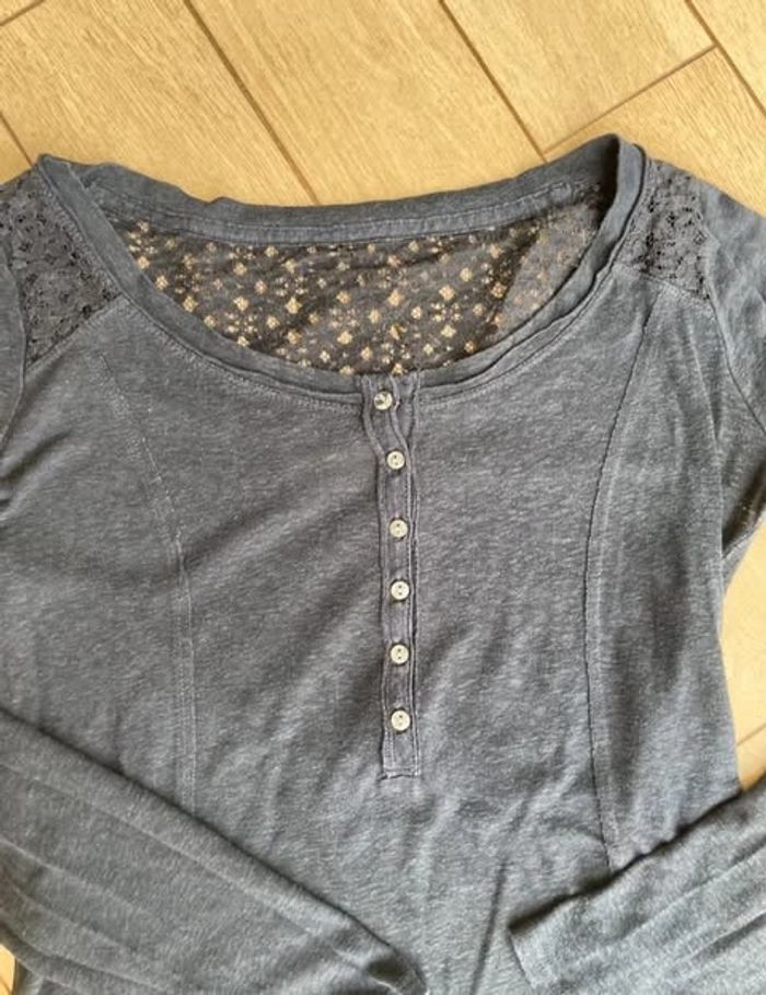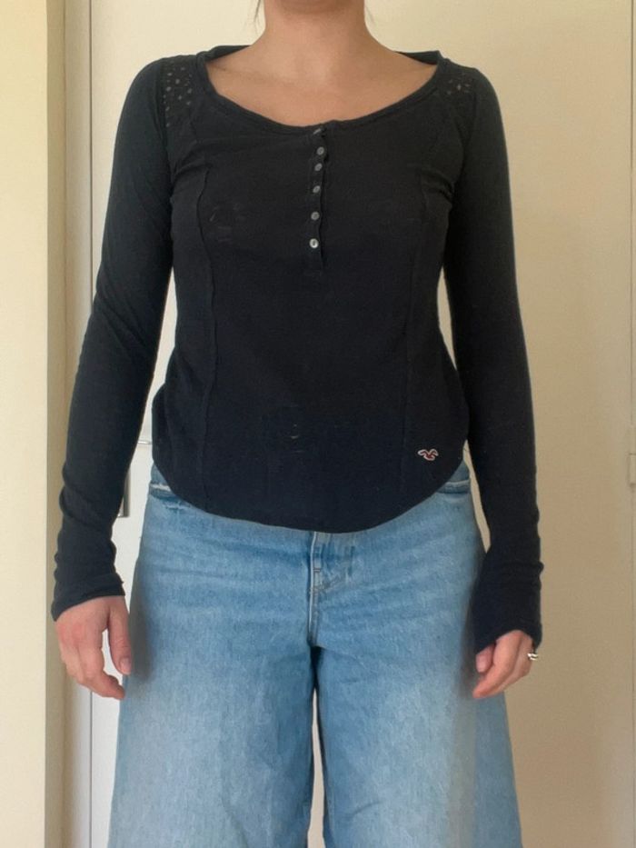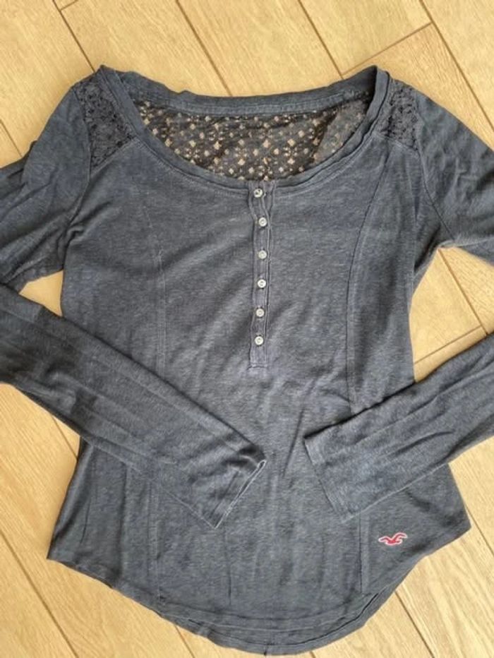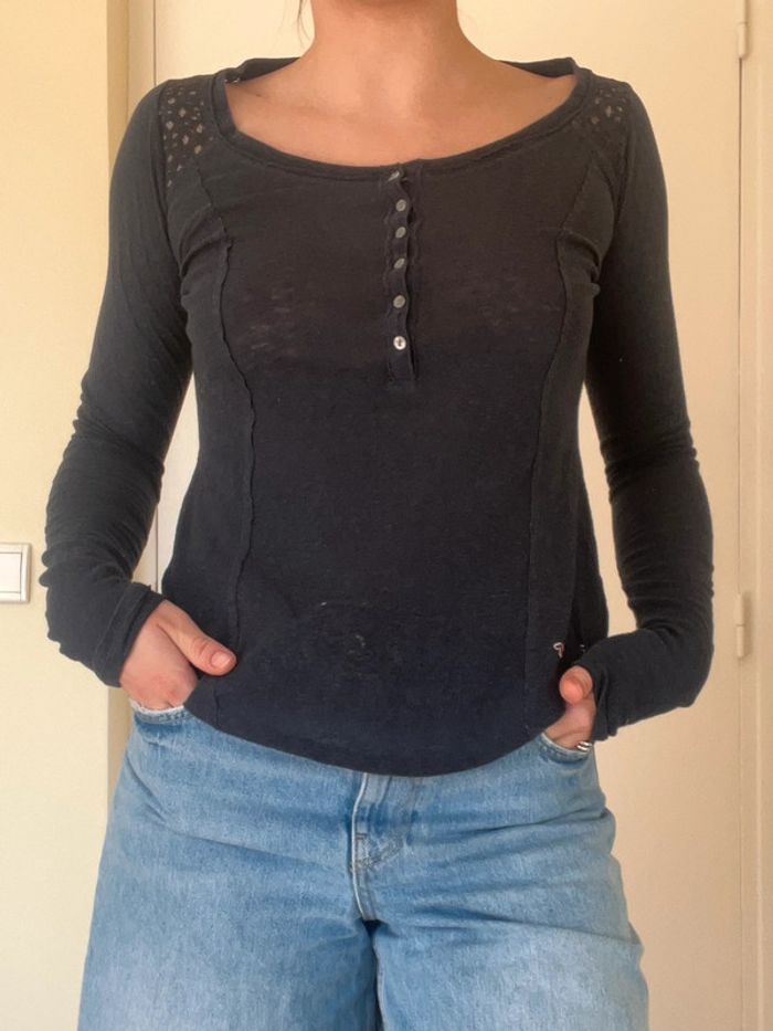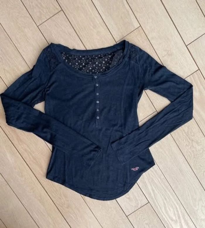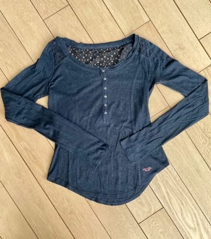 🌸 Tee shirt manches longues Hollister, détail en dentelle sur le haut du tee shirt, 6 boutons sur le devant (le dernier effet transparent diamant)