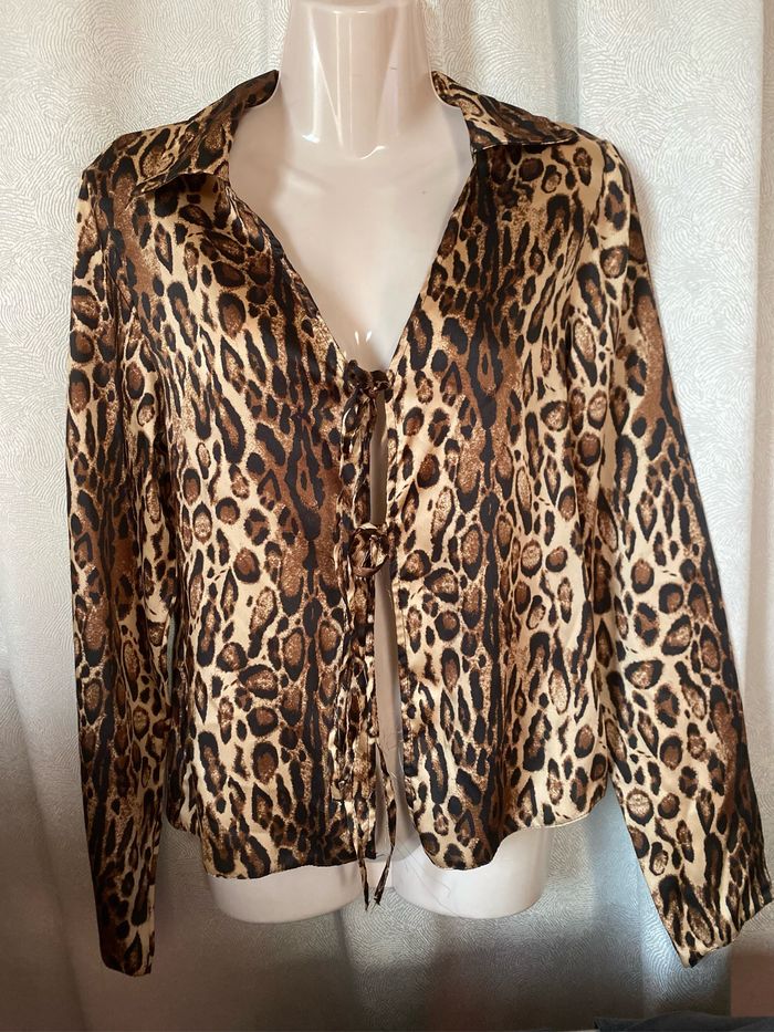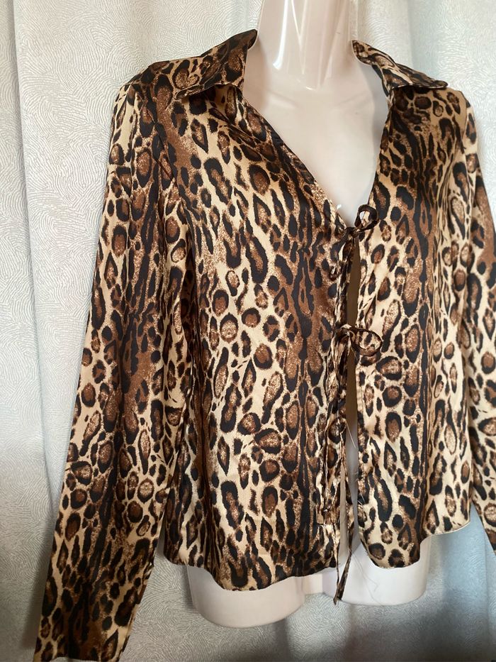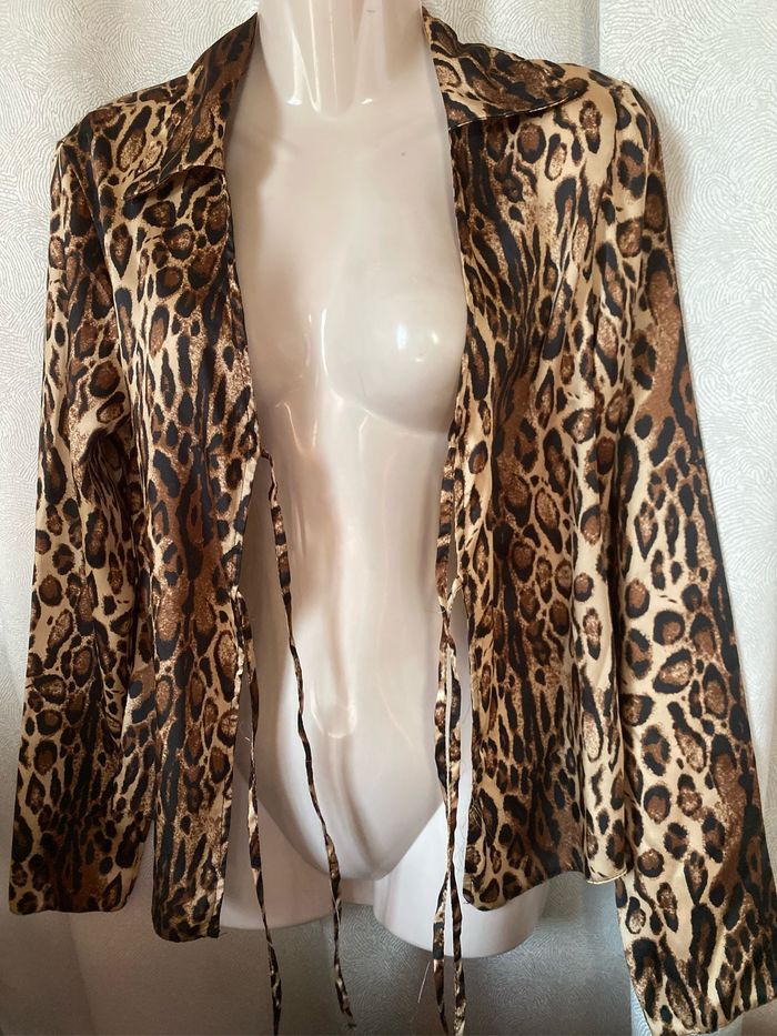 Chemise tunique blouse satiné léopard panthère À nouer ou pas devant 100% polyester Taille XS , peut convenir aussi pour un 36 Primark Carrure 37,5 cm Aisselle à aisselle 43 cm Longueur 59 cm