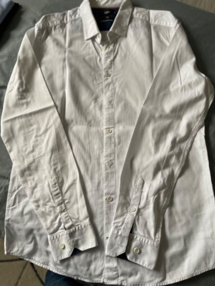 Portee une fois pour un mariage, chemise blanche manches extra longues. Touches bleu marine, taille XL