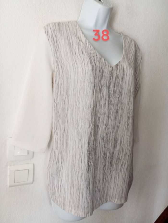 Blouse en excellent état comme neuve Marque KIABI. Couleur crème, beige, légèrement irisé argenté #Patnimestaille38 Longueur dos 58 cm, devant 65 cm