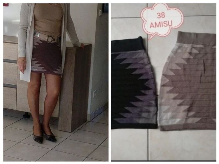 Lot de 2 jupes moulante hiver femme, taille 38 En maille fine . Marque AMISU Couleur beige marron et violet foncé et noir En très bon état Longueur 37 cm. Taille élastique. Vous pouvez cliquer sur le lien ci-dessous pour voir tout mon 38 #Patnimestaille38