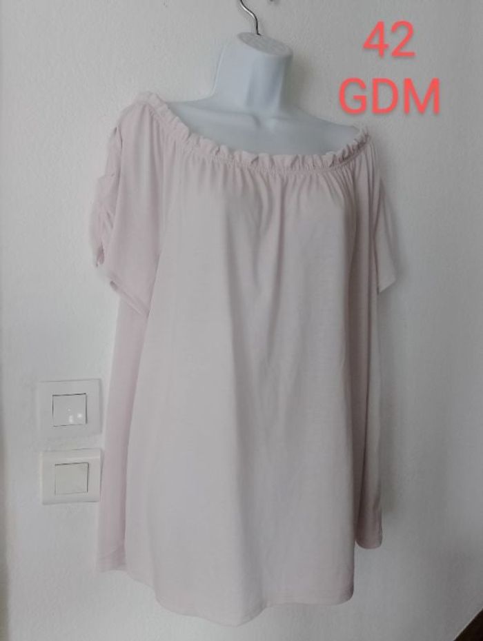 #Patnimestaille42 Superbe tee shirt femme taille 42 en excellent état Marque GRAIN DE MALICE Fronce pour épaules dénudées ou pas Couleur rose pâle. Longueur 58,5 cm. Vous pouvez cliquer sur le lien ci-dessus pour voir tout mon 42