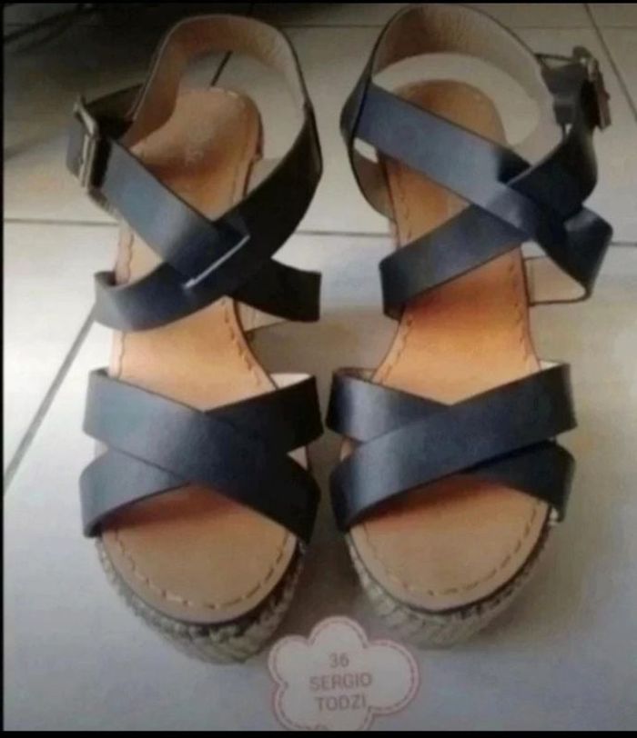 Superbe compensé femme, pointure 36. En excellent état comme neuve (semelle lavé mais reste sombre) . Marque SERGIO TODZI. Hauteur 11 cm. Vous pouvez cliquer sur le lien ci-dessous pour voir tout mon 36 #Patnimespointure36
