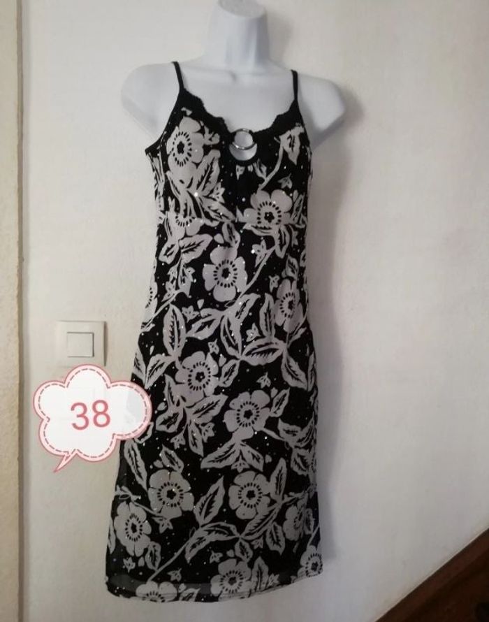 #Patnimestaille38 Superbe robe fluide en taille 38. Très agréable à porter, non transparente. Couleur noir blanc. Longueur 85,5 cm. Produit Français. En très bon état Vous pouvez cliquer sur le lien ci-dessus pour voir tout mon 38