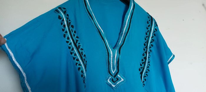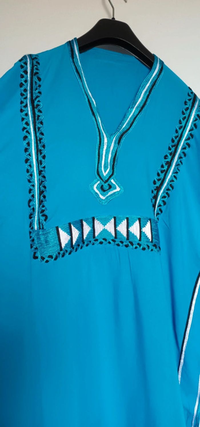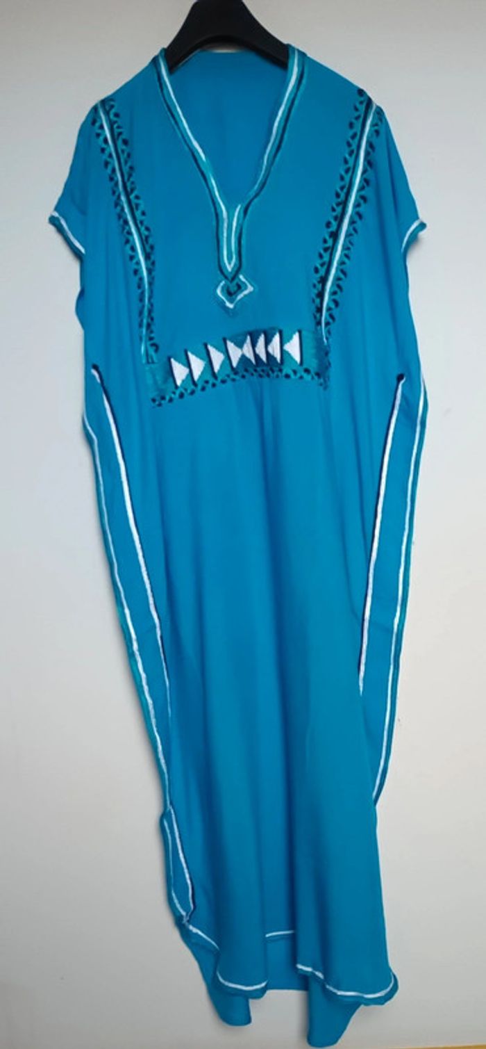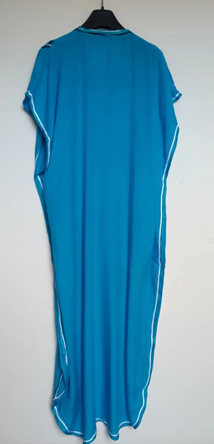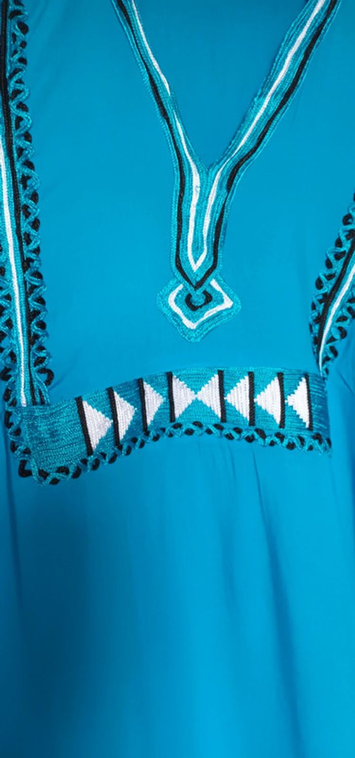Robe longue turquoise brodée noir et blanc, sans manches, large qui retombe sur les bras, effet manches courtes.