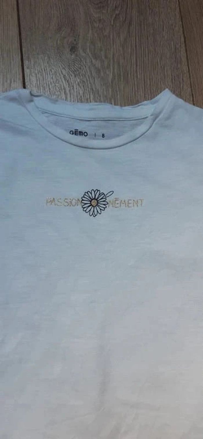 JE N'ACCEPTE PAS D'OFFRE MERCI Tee-shirt Manches courtes volantées Gémo blanc inscription dorée "passionnément" 8 ans en très bon état Pour visualiser tous ce que je possède en 8 ans : #ambre626908ans