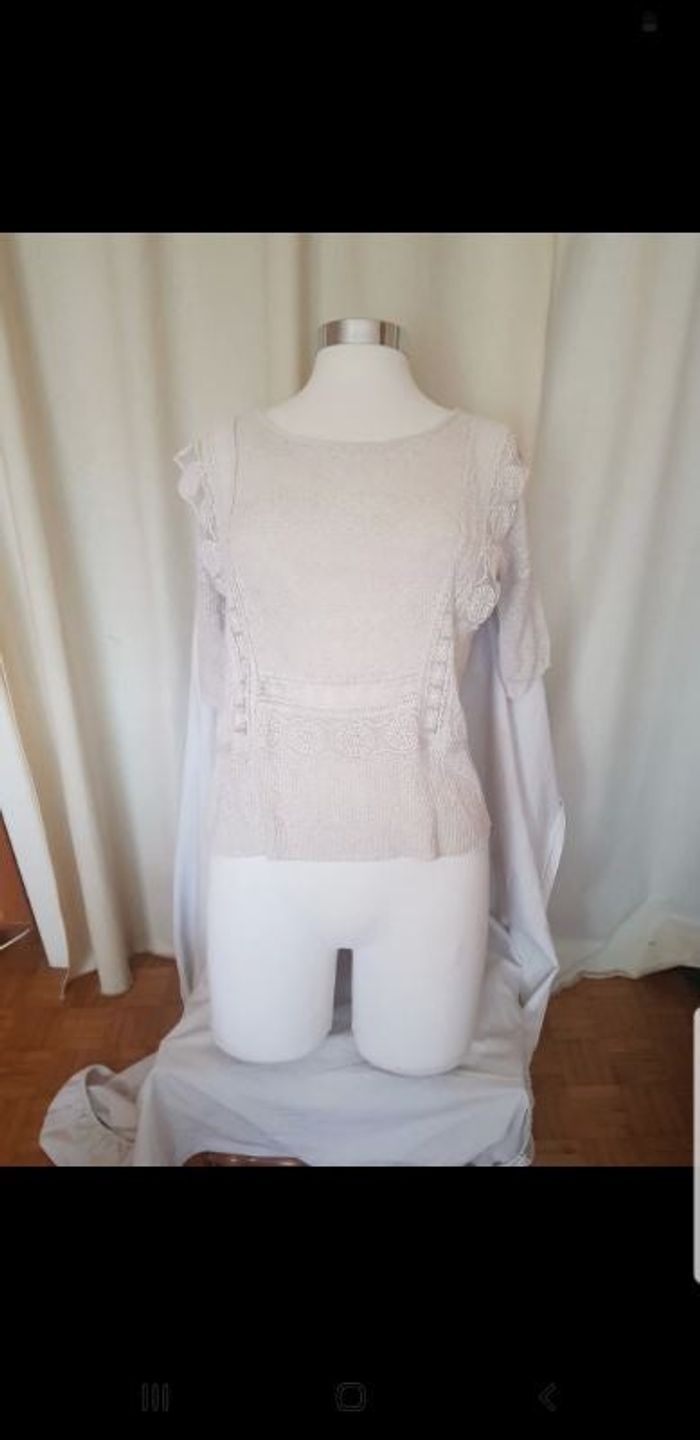 Avec dentelle sur les côtés ( devant) . Léger et ample. Couleur beige très clair.