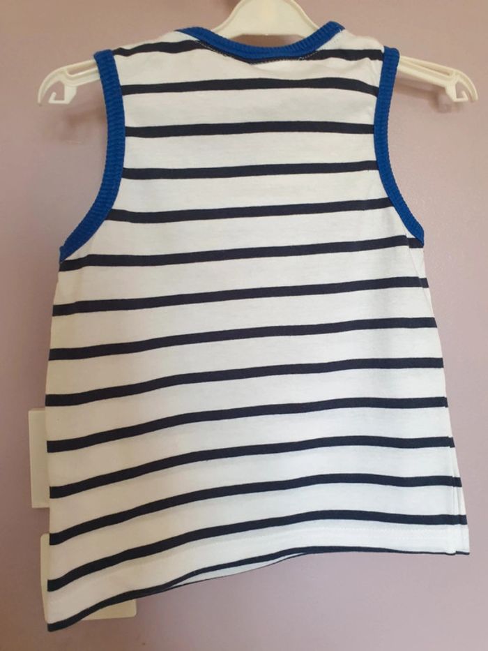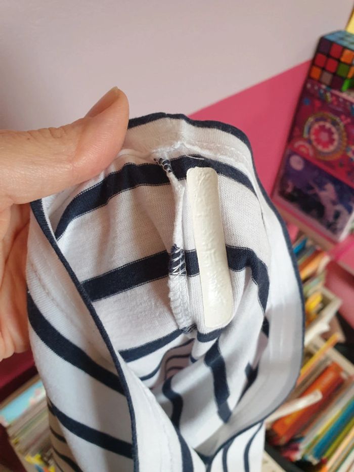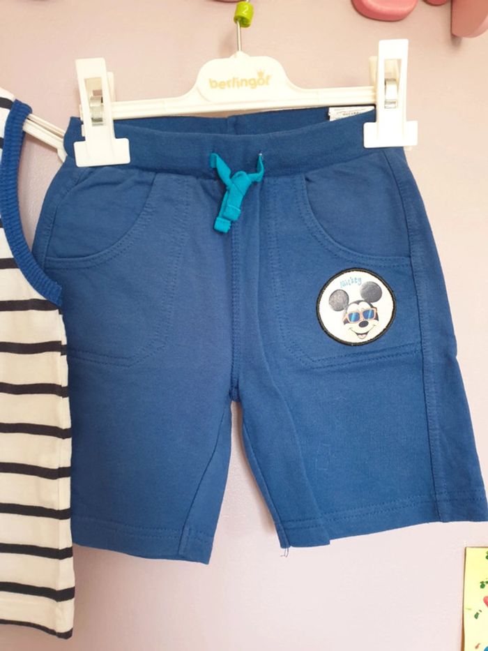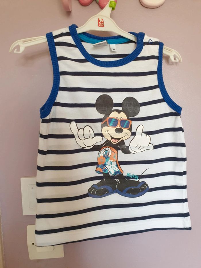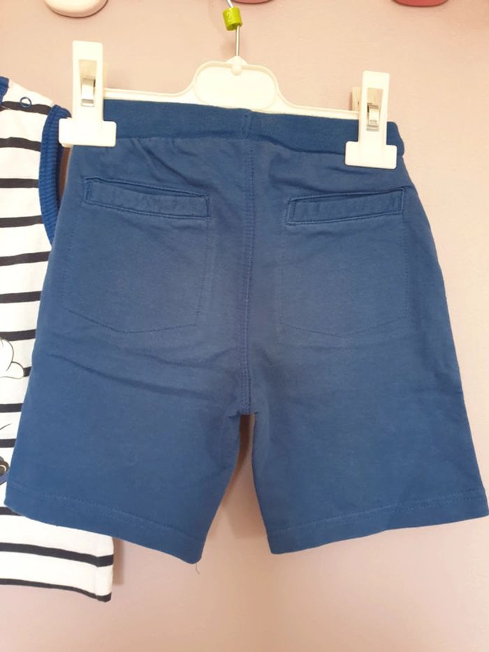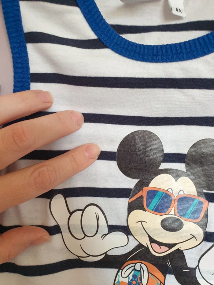 Composé d'un débardeur rayé + short, 4 ans. Le débardeur présente, au dessus de Mickey et sur le côté le long de la couture, des traces "tâches" mais que j'ai du mal à montrer sur les photos. De plus, il y avait le nom de mon fils c'est pour cela qu'il y a 1 étiquette blanche à l'intérieur du débardeur. #garçon4ansgain_de_place