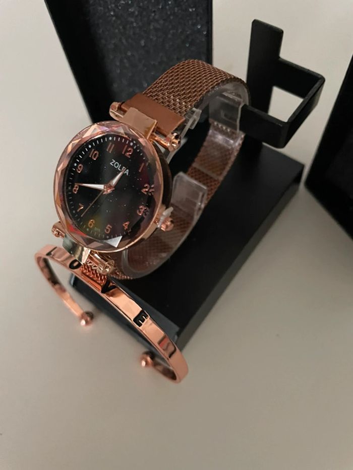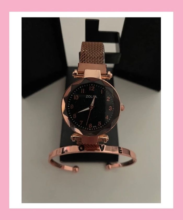👩🏻 : montre et bracelet assorti Bracelet rose gold Cadran noir Les articles sont neufs Envoi rapide et soigné Bon shopping 🛍️