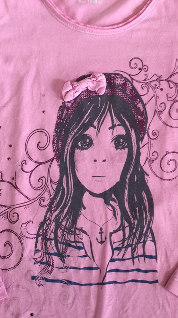 motif buste fille avec noeud fantaisie dans les cheveuxet des quelques strass défauts : un petit trous sur une manche et des taches sur la même manche et marques de pince à linge en bas