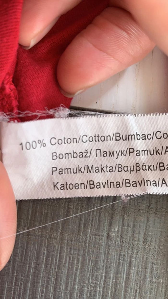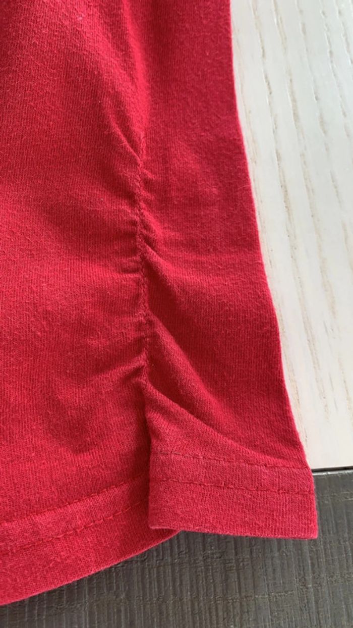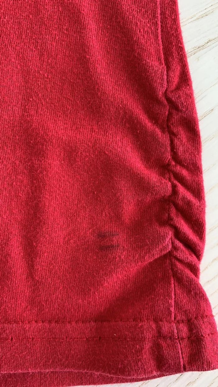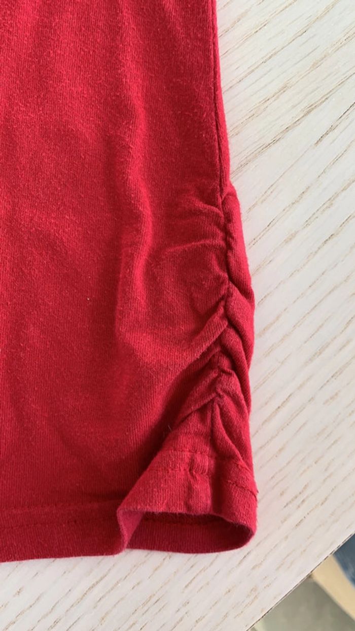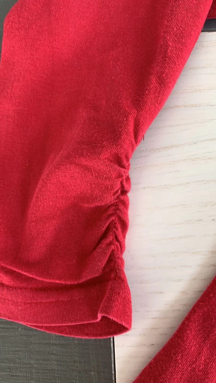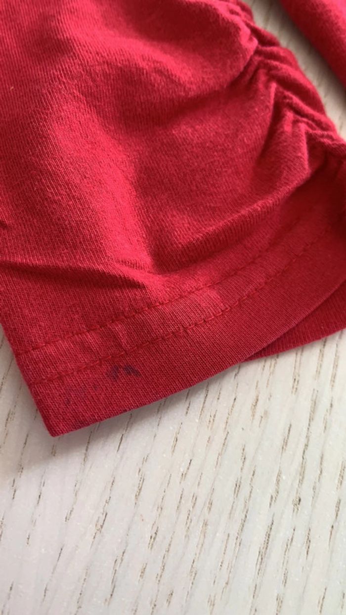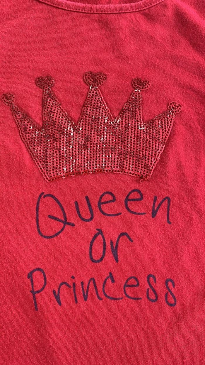 rouge avec couronne en strass fantaisie manches et bas tee-shirts couture élastiques. la manche droite la couture est détendue (3eme photo en partant de la fin) défaut : 1 marque derrière de pince à linge ( avant dernière photo) et une petite tache bleu manche droite (dernière photo) #thol70fille8ans