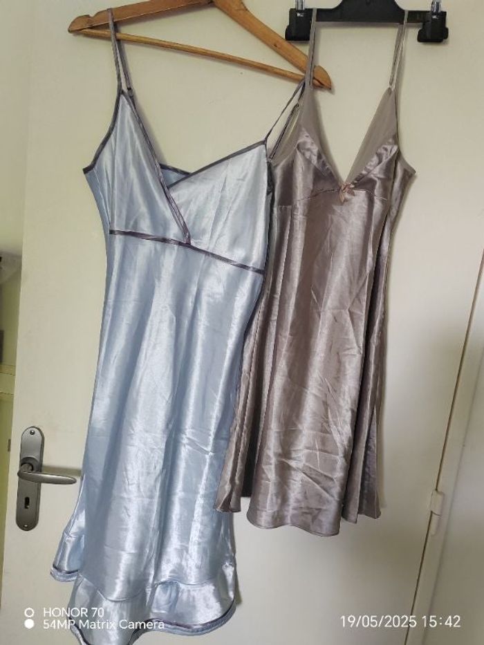 Une longue et une courte. Larheur a plat sous les aisselles 46 cm Longueur 90 cm et cm de sous l'aisselle en bas de la robe. Bretelles reglables Portees une ou deux fois Matiere satinee légère et agréable à porter. Taille L/40 #geliscyrilletaille40 #geliscyrilletailleL ##caisse5