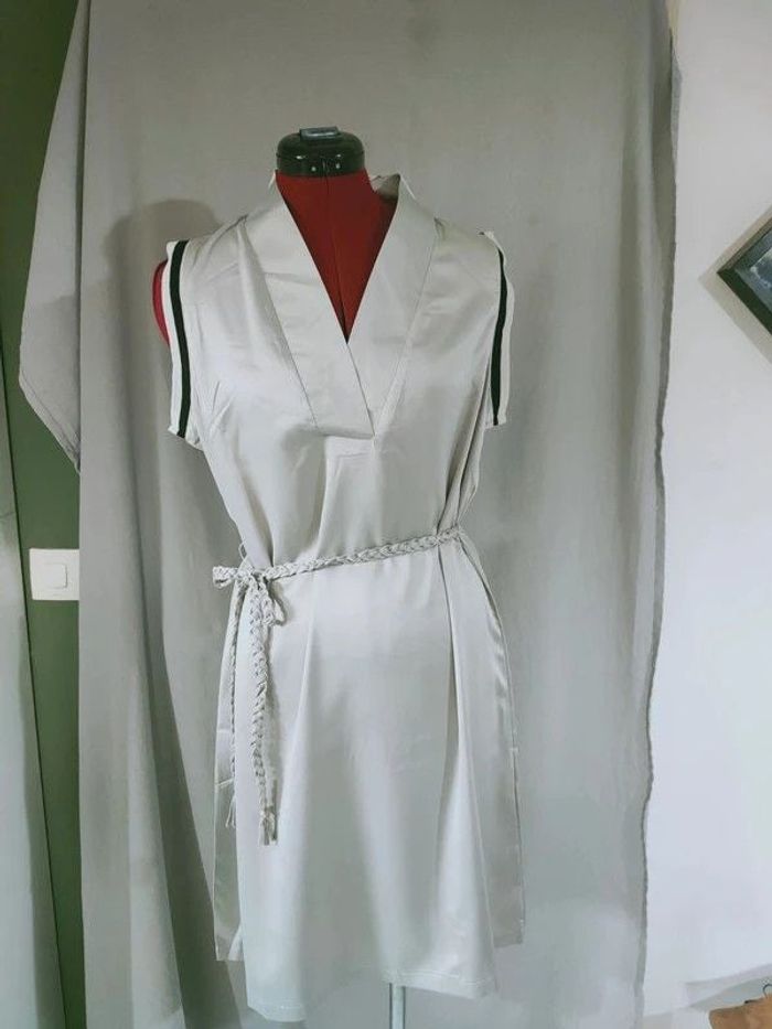 ❗Hors réductions,❗ Neuve . Matière fluide et satinée Légèrement extensible Ceinture tressée Largeur sous aisselles a plat 53 cm Largeur au niveau de la ceinture 52 cm Longueur 90 cm Col v MARQUEG-MAXX #geliscyrilletailleL #geliscyrilletaille40 ##CAISSE21