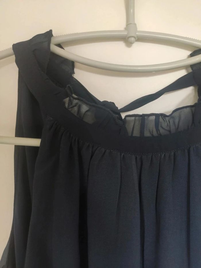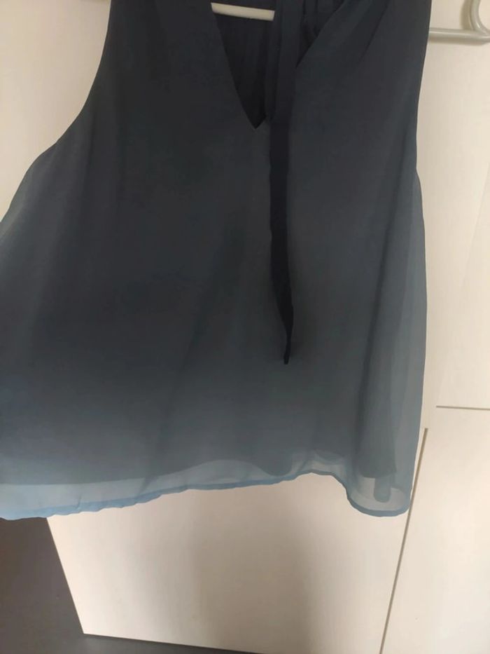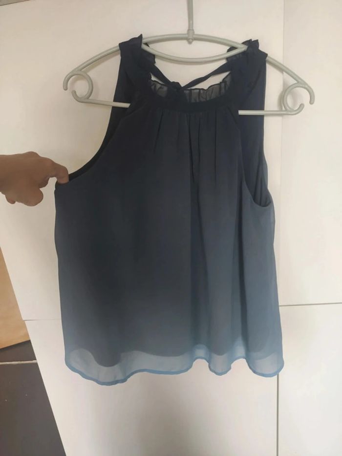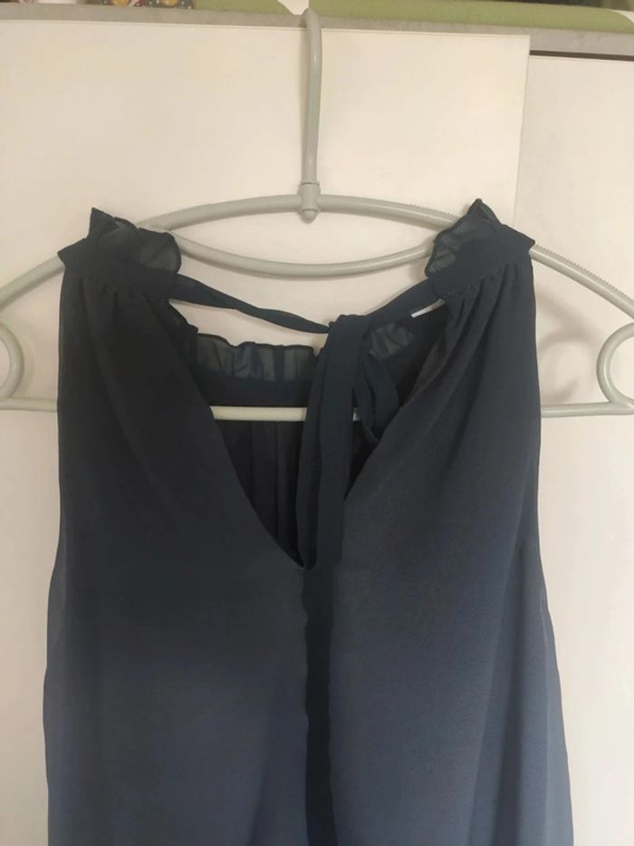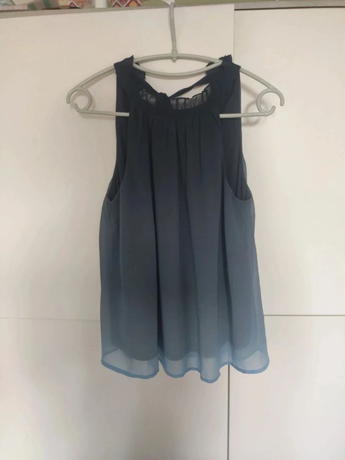 Chemisier top débardeur tunique sans manches.dans un dégradé de bleu, de bleu foncé au col à bleu clair en bas, entièrement doublé donc pas de transparence. Joli détail au col, décolleté en v au dos et lien pour fermer le chemisier. Très bon état, marque vera moda, taille s. Longueur totale 60 cm