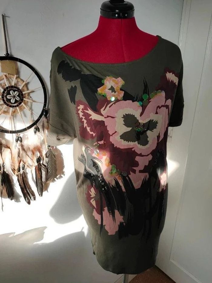 Tunique imprimée et strass Déconnecter au niveau du dos Portée une fois Longueur totale 80 cm Largeur à plat au niveau des aisselles 52 cm #geliscyrilletailleM #geliscyrilletaille38 ##caisse19