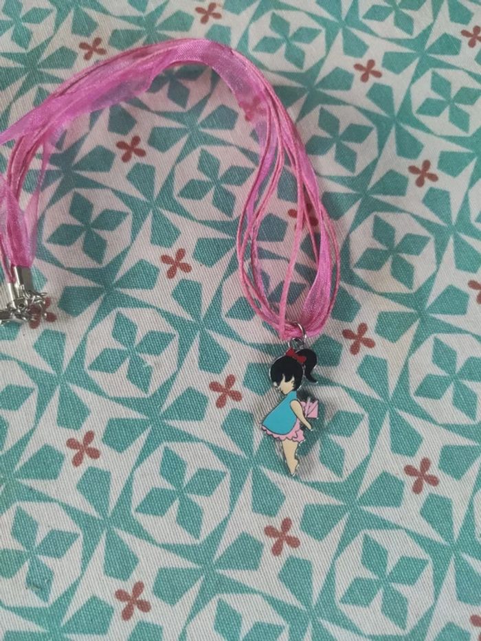 Collier neuf avec un pendentif en métal petite fille. Lien du collier en coton et organza. Joli lien rose #vulariBijoux