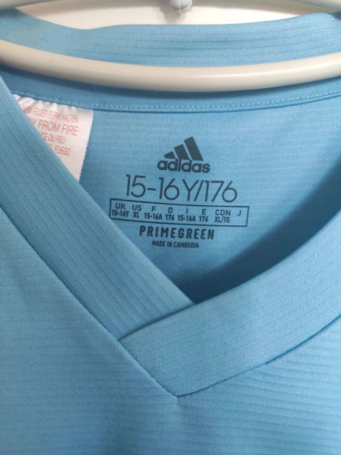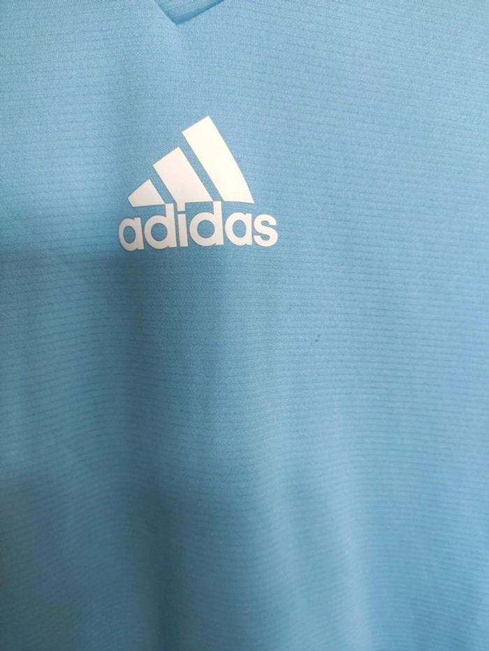 Tee-shirt d'entraînement à manches longues aéro ready Adidas. Pour le foot ou tout autre sport. Séchage très rapide, acheter à sport 2000. Taille à 15 / 16 ans, à noter deux mini taches noires en dessous du logo, même pas sûr qu'on les voit sur la photo tellement elles sont minuscules mais je préfère le préciser... 2 petits accros sur les manches. Couleur bleu clair comme l'OM 😂 #vulariGarcons15ans #vulariGarcons16ans #vulariAdidas