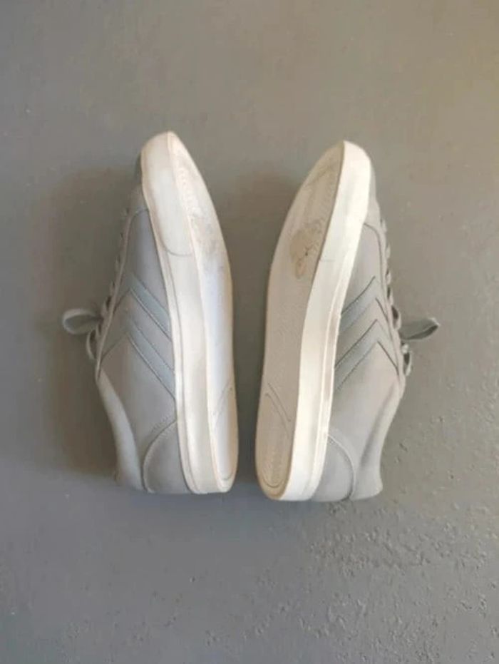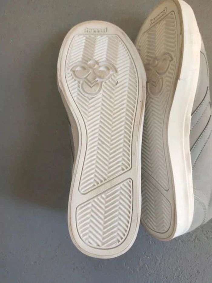 Chaussures tennis en bon état, nécessitera un petit nettoyage, la semelle extérieure est impeccable. j'ai enlevé la semelle intérieure, ça a un peu jauni, il faudra prévoir de mettre une autre. Pointure 40. Marque Hummel. Couleur gris