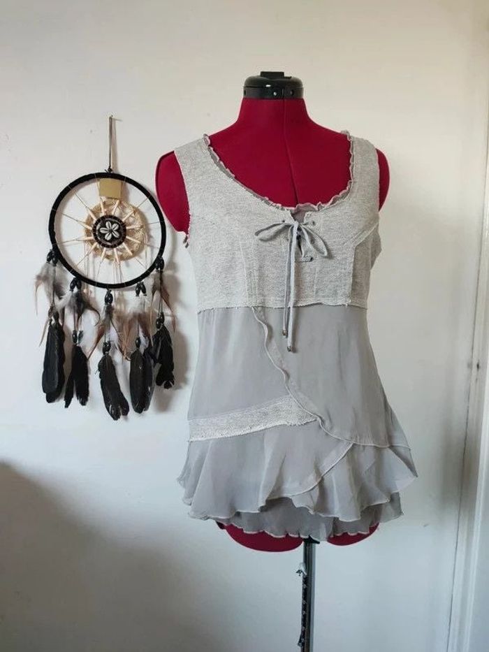 Fluide et léger Matière extensible Taille 3 correspond a un 40 Fermeture invisible sur le côté Porté une ou deux fois Largeur à plat sous les aisselles 42 cm Longueur totale 62 cm #geliscyrilletailleL #geliscyrilletaille40 ##caisse4