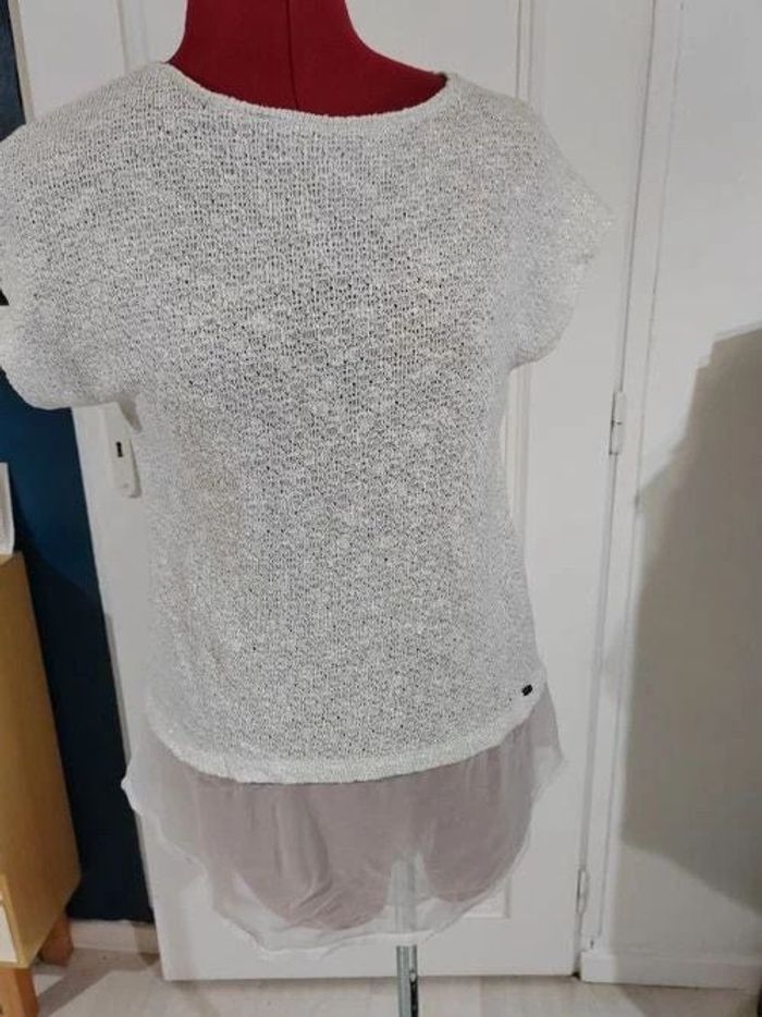 Peu porte Ouvert dans le dos laissant apparaître le voile blanc transparent. Largeur à plat sous les aisselles 42 cm Longueurtop 48 cm longueur totale 64 cm devant 73 cm derrière Petits fils argentés #geliscyrilletailleM #geliscyrilletaille38 ##caisse8