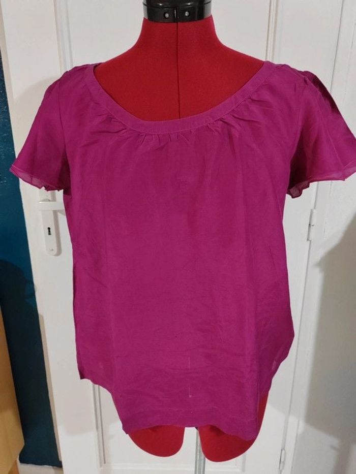 top léger mélange soie et coton. Très agréable à porter . Volants sur les manches Largeur à plat sous les aisselles 51 cm Largeur bas du top 58 cm Longueur 60 cm #geliscyrilletailleL #geliscyrilletaille40 ##CAISSE8