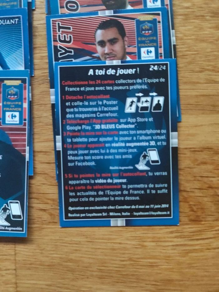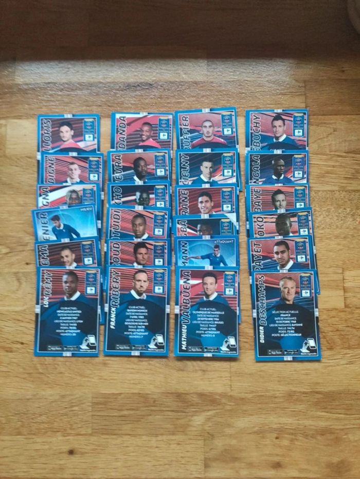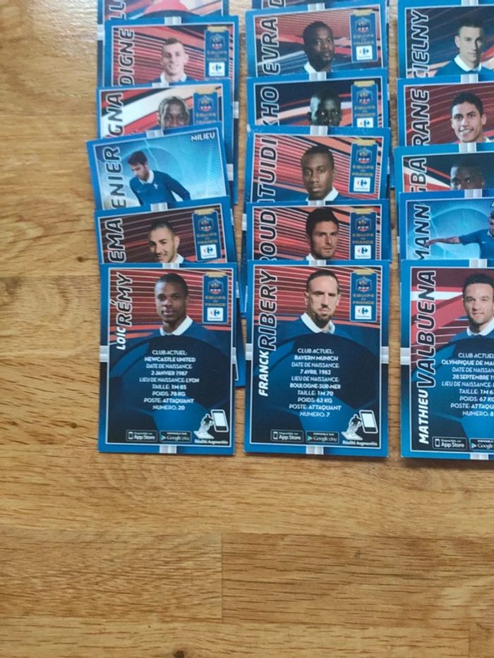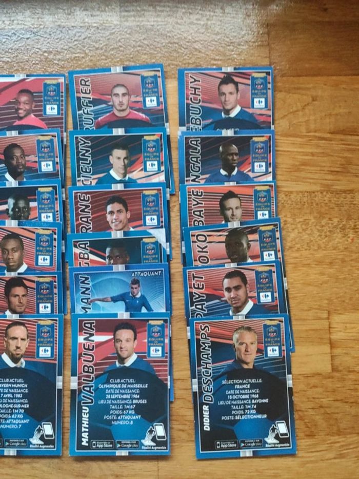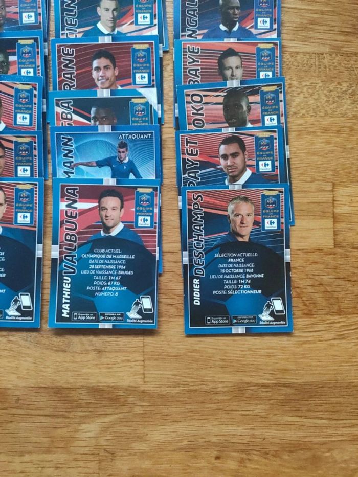 Les 24 cartes collector équipe de France de Carrefour 2014. Toutes les cartes sont en format portrait avec la date de naissance, lieu de naissance, taille, poids et poste dans l'équipe sauf deux cartes en format silhouette. Très bon état sauf 3 ou 4 cartes avec un coin un peu abîmé