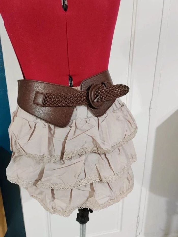 Jupe a volants avec grosse ceinture . Très bon etat Longueur 34 cm Largeur taille 30 cm a 47 cm en tirant sur l'élastique #geliscyrilletailleS #geliscyrilletaille36 ##caisse11