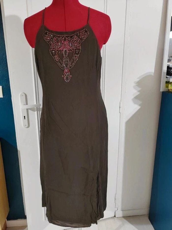 Robe bretelle fine marron broderie sur le devant. Portée deux fois très bon état. Fendue sur le côté gauche avant. Fermeture au dos Longueur genou Longueur totale environ 112 cm Largeur à plat sous les aisselles 45 cm Taille a plat 42 cm environ Hanches 51 a plat environ #geliscyrilletaille42 #geliscyrilletailleXL ##CAISSE32