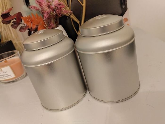 Neuves Diamètre 8.5 Hauteur 20 cm Couvercle de protection pour une meilleure étanchéité. Il offre une protection efficace contre l’air, la lumière et l'humidité, ain de preserver l'arôme de votre thé de manière optimale Contenance environ 100g. #geliscyrilleaccessoire