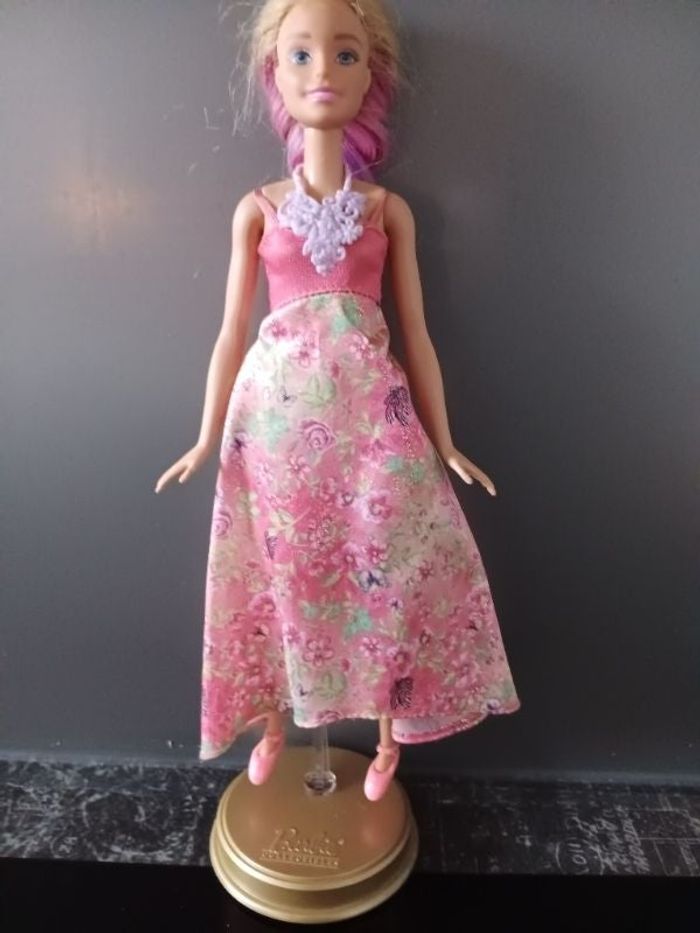 Barbie dreamtopia Chevelure fantastique Change de couleur en tournant le cuir chevelue. Côté blonde Côté mèche rose et violine . Très bon état Je rajouterais une brosse et des élastiques dans le colis .