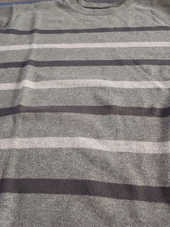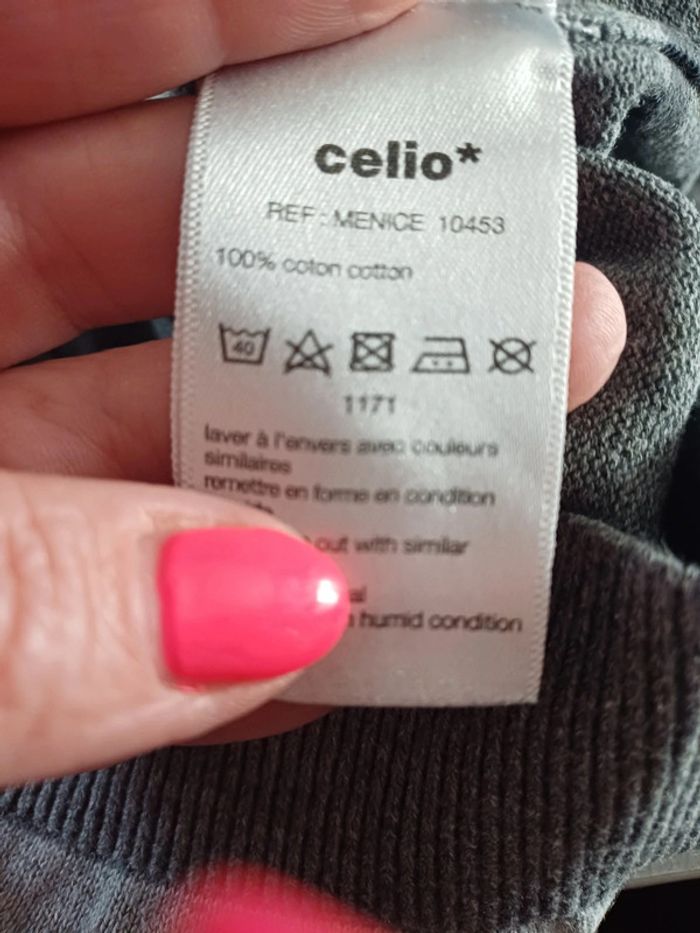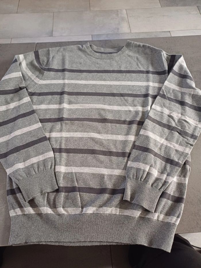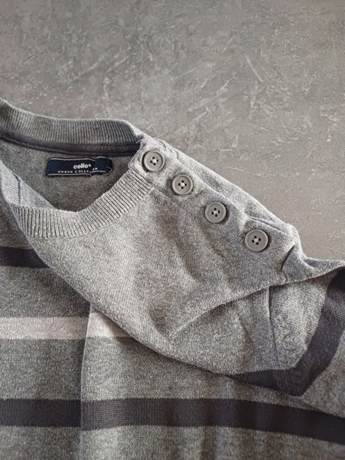Excellent état Marque celio Taille L 100% coton Rayures grises 4 boutons sur épaule gauche Largeur sous aisselles 55 cm Longueur 66 cm Longueur manche 63,5 cm