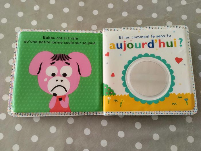 Livre pour bébé pour découvrir les émotions en images Matière adaptée au bain 8 pages Dimensions : 14cm X 14cm Le miroir en fin de livre est rayé mais tout à fait utilisable pour que bébé se regarde #nitnit8579livres