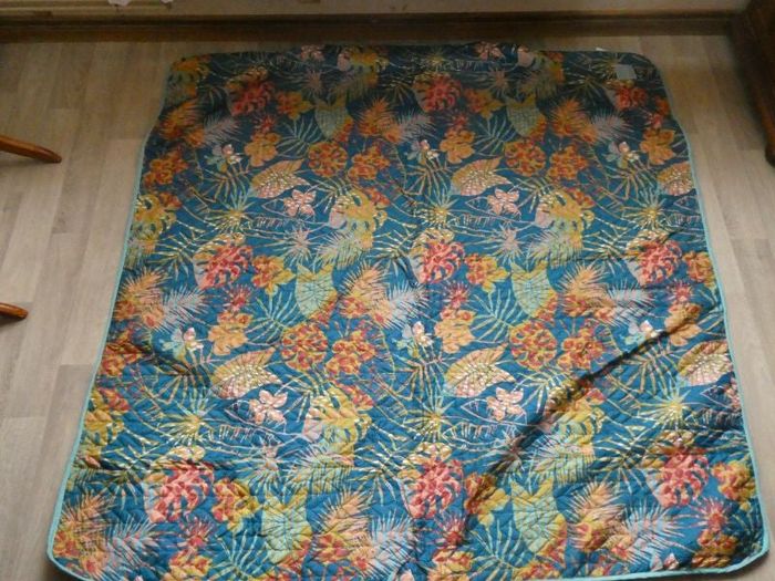 Plaid motif "jungle". 1 côté motif et l'autre côté bleu uni. Dimensions : 155 x 155 cm environ. 100 % polyester. Très bon état. Envoi possible au tarif en vigueur.