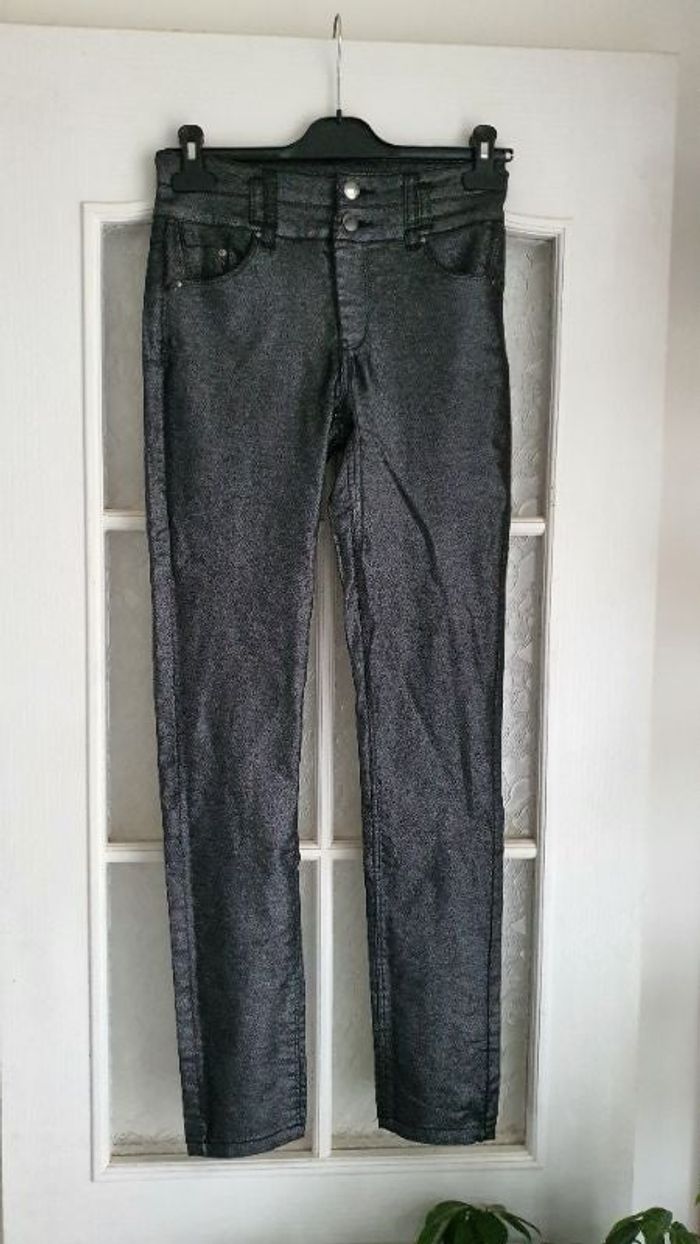 Pantalon argenté. Taille haute Longueur 104 cm 72% coton, 26 % polyester, 2% elastane Très bon état jamais porté Taille 36