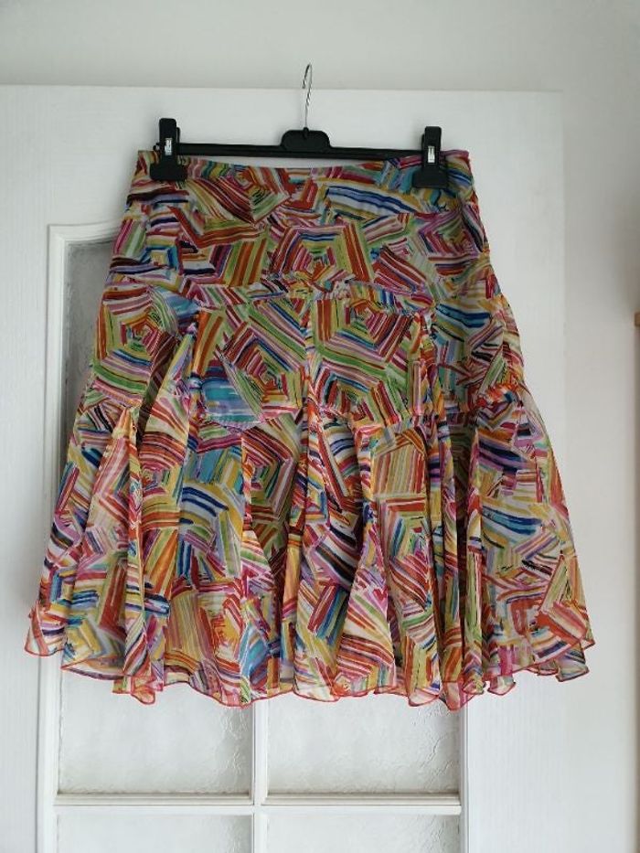 Jupe mi longue bariolée. Doublure noire Fermeture eclair sur le côté gauche Taille 40 100% polyester Longueur 58 cm Très bon état
