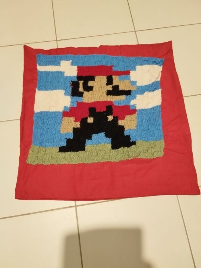 Taie d'oreiller fait maison, avec un Mario pixel fait au tricot. En bon état, quelques maillages peuvent être resserrés. Taille de la taie environ 65x65.