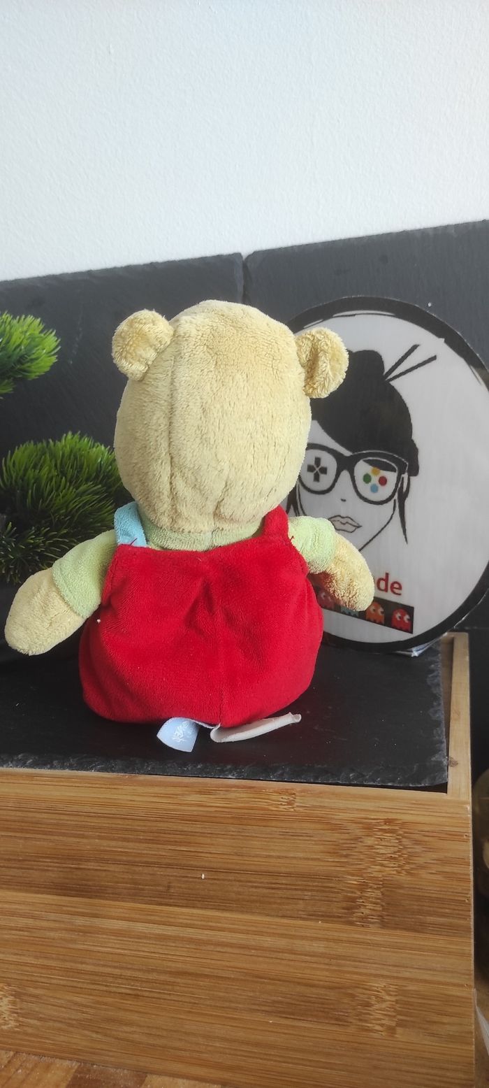 Doudou Peluche Winnie Salopette rouge Etiquettes vert Disney Baby Nicotoy rond feuille - photo numéro 1