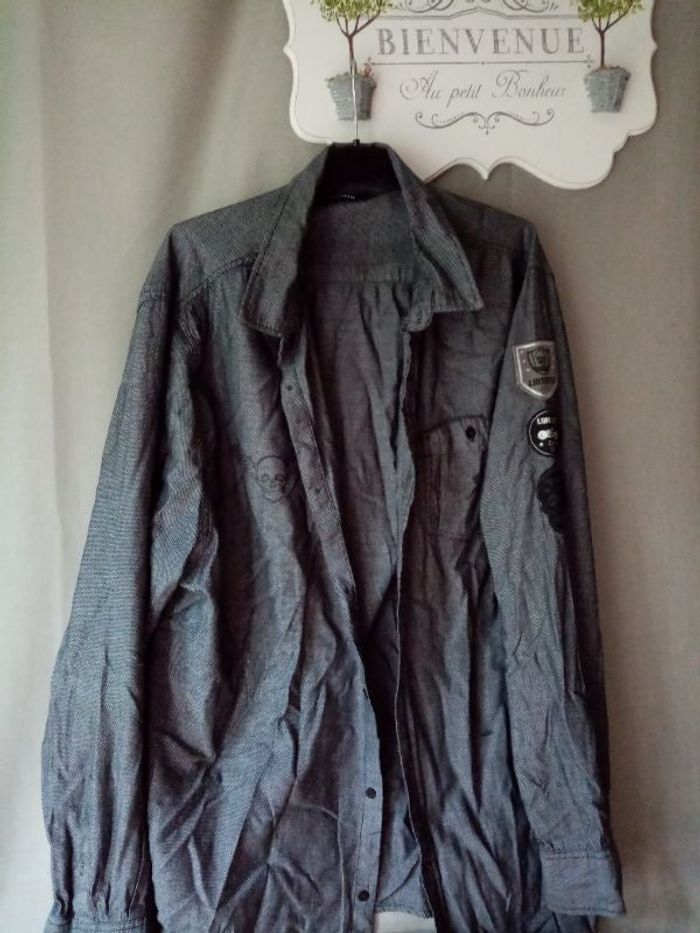 Chemise très bon état Avec poche poitrine a gauche Impression tete de mort a droite et sur la manche gauche Peut se porter en toute saison mais plus pour automne et printemps Taille xxl Désolée un coup de fer sera nécessaire