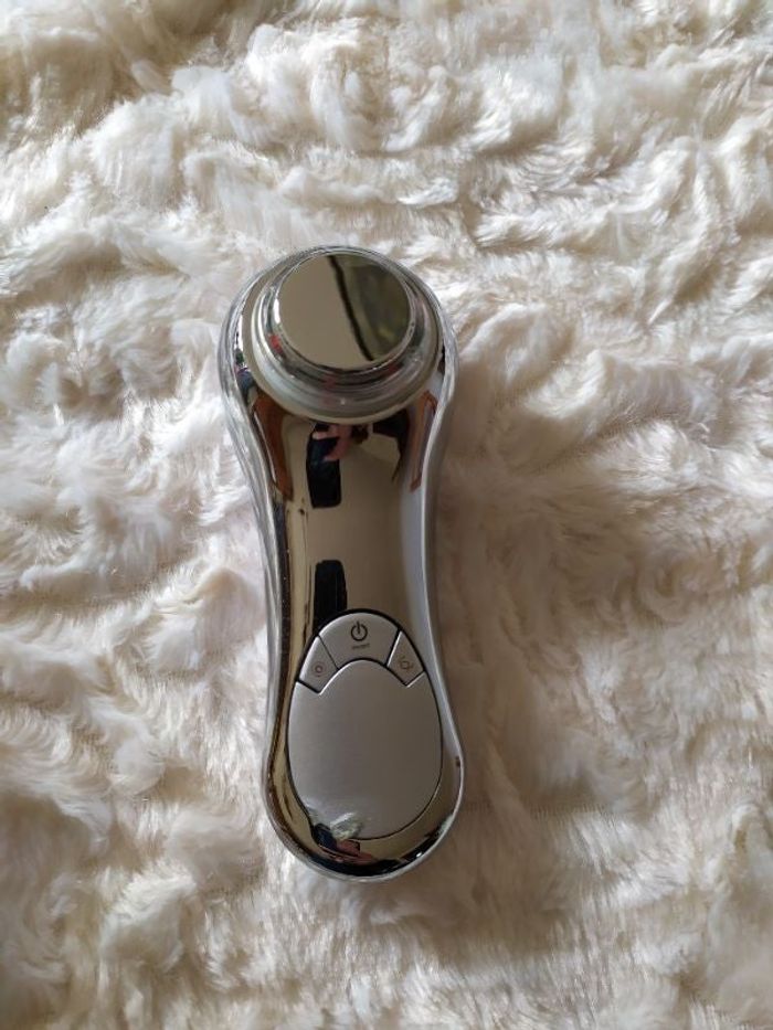 Masseur galvanique pour le visage, s'utilise après l'applications des crėmes/soins afin d'augmenter leur absorption et leur efficacité, et pour améliorer le renouvellement cellulaire. Il a un défaut d'origine dans le plastique à l'avant mais fonctionne parfaitement. 3 boutons, un pour l'allumer/l'éteindre, celui de gauche active/désactive la fonction galvanique, et celui de droite les vibrations. Fonctionne sur piles.