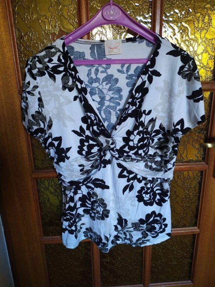 Haut en matière extensible avec décolleté en V. Jamais porté car le décolleté est trop profond pour moi. Taille 42/44