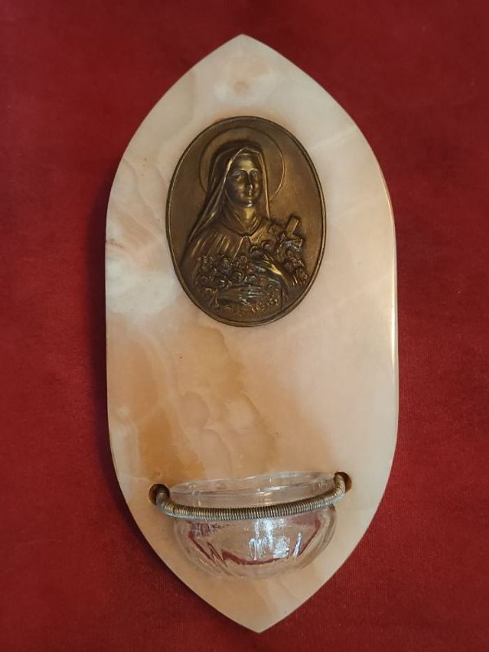 Vends ancien bénitier en marbre (n°13) , médaillon sainte Thérèse, bénitier en vieux verre, hauteur 15 cm , largeur 7,5cm