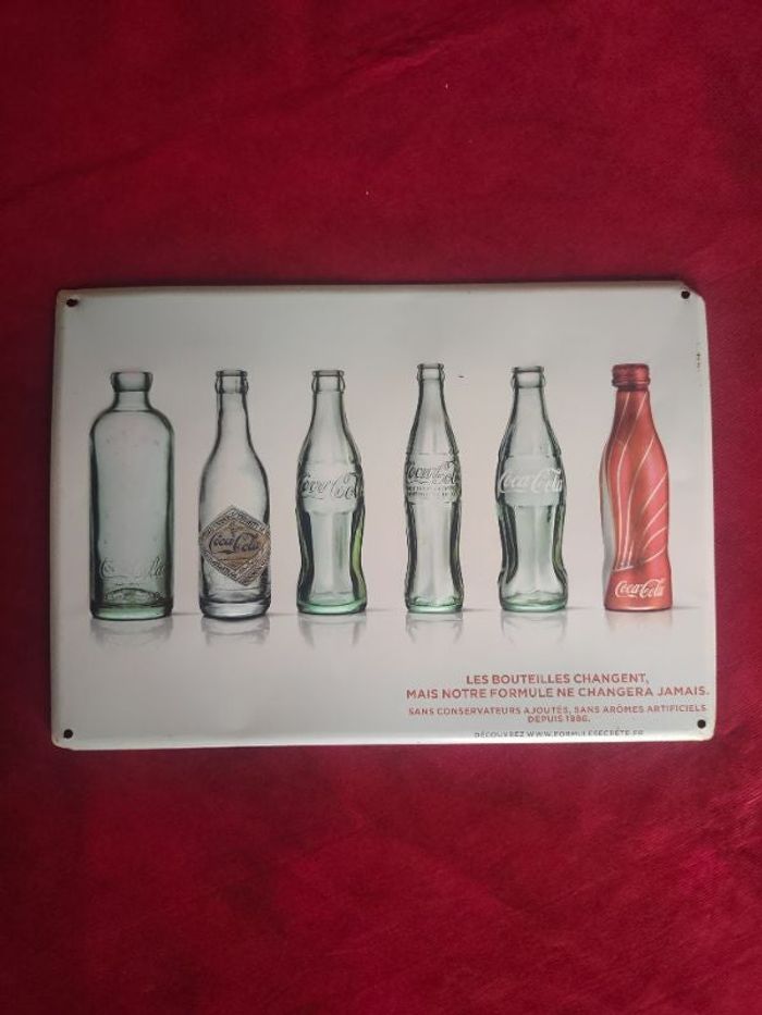 Vends plaque publicitaire coca cola en métal, largeur 30 cm , hauteur 21 cm , les bouteilles changent mais notre formule ne changera jamais, bouteilles en relief