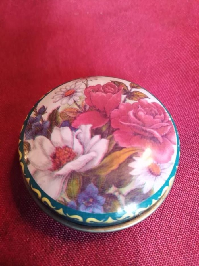 Vends boite à pilule en métal avec des marguerites et des pivoines diamètre 4 cm