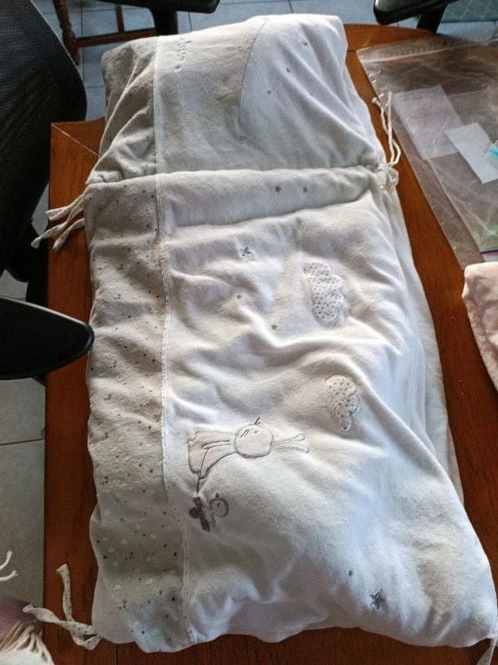 Tour de lit blanc/gris Kiabi, 3 panneaux, 160X40, 76% coton, 24% polyester, garnissage 100% polyester. TBE