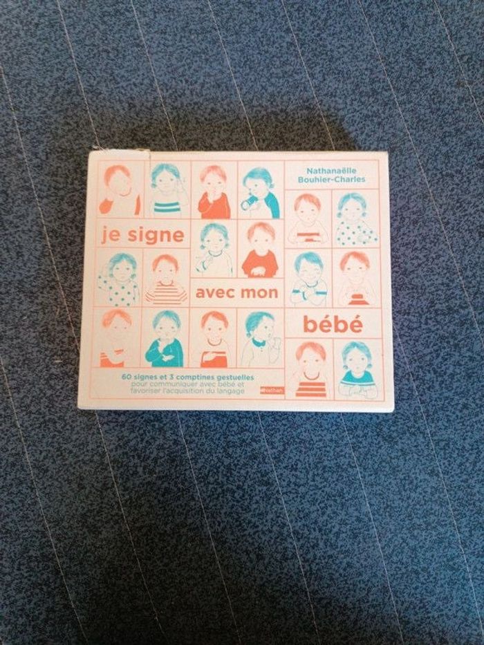Coffret je signe avec mon bébé. Éditions Nathan. 30 fiches de 60 signes. 3 comptines. 1 livret. ISBN 9782092790977 . Coffret endommagé sur un bord. TBE