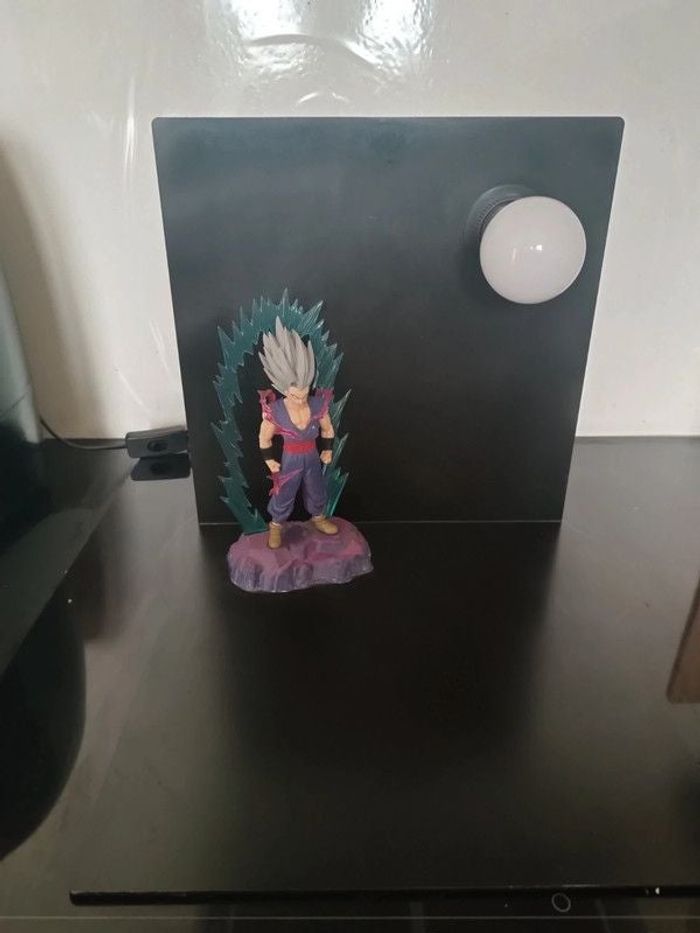 Lampe en métal Végéta fait par un artisan Fonctionne parfaitement. 30*30 cm Figurine un peu abîmée cf photo Légère trace sur la peinture dû a un autocollant retiré cf photo Idéal pour poser d'autres figurines