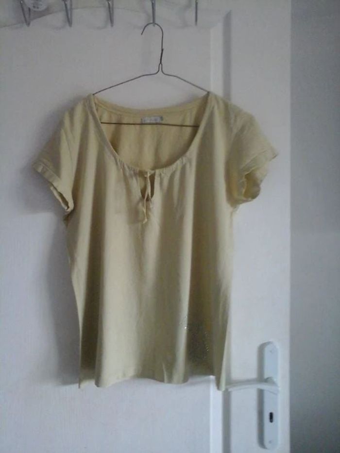 T-shirt de nuit jaune In Extenso - Taille 42/44 - Longueur 60 cm, largeur aisselles 50 cm, manches courtes - col rond avec lien de serrage - Chat brillant strass dans le bas - 100% coton - TBE
